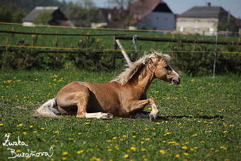 , 2009, celý kůň, hřebec, hřebec bohemian freyr, jaro, jeden, ležení, na šířku, pastvina, slunečno, válení, welsh mountain pony (a), žluťák, |