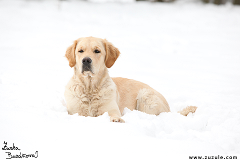 , 2010, celý pes, dospělý pes, janika od bílé břízy, jeden, ležení, na šířku, sníh, zataženo, zima, zlatý retrívr, |